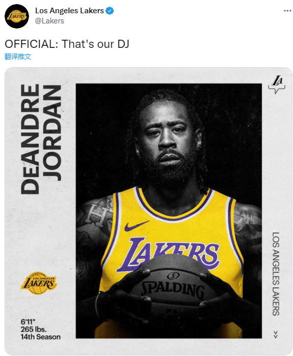 24直播网9月10日讯 篮网旧将小乔丹正式签约湖人,洛杉矶湖人已经官宣引援这位全明星中锋,晒照并配文:这是我们的DJ(小乔丹名字的缩写);此前小乔丹被篮网交易离队,和活塞达成买断后加盟湖人,新赛季他将辅佐湖人三巨头冲击总冠军。