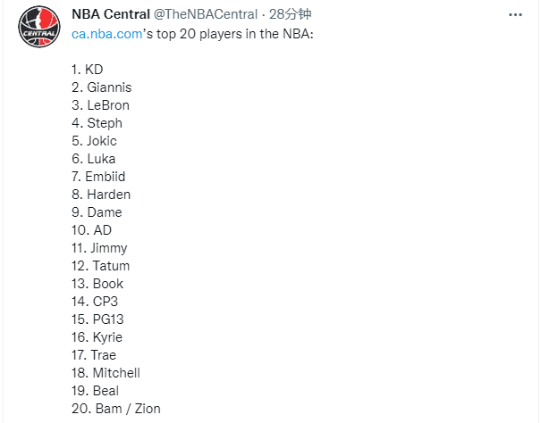 第11-20排名依次是巴特勒、塔图姆、布克、保罗、乔治、欧文、特雷-杨、爵士米切尔、比尔以及阿德巴约和锡安并列第20名。