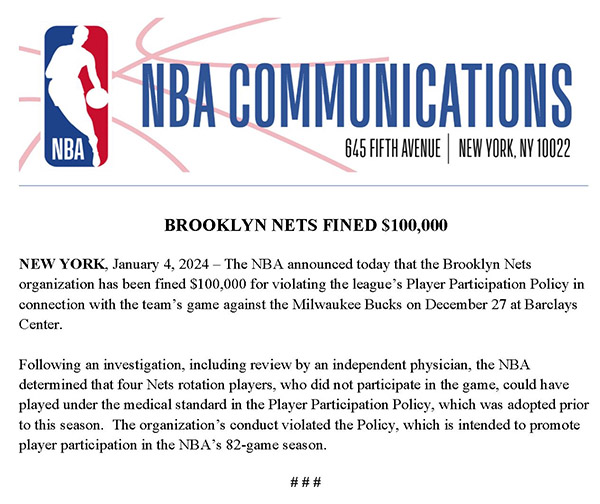 NBA官方:篮网违反球员参赛政策 被罚款10万美元