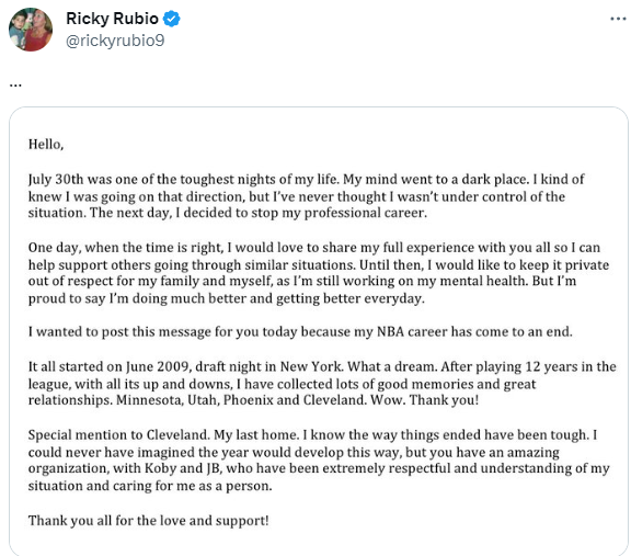 在2023年休赛期,卢比奥因精神健康问题而宣布暂停从事篮球活动,如今他与骑士达成买断,并且正式宣布退役,结束12年NBA生涯。