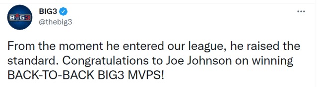 24直播网9月05日讯 ,BIG3联赛官方宣布,40岁的乔-约翰逊当选2021年的最有价值球员(MVP),这是他连续第二个赛季获得这一奖项。本赛季,乔-约翰逊以182分的总得分刷新了BIG联赛的得分纪录。