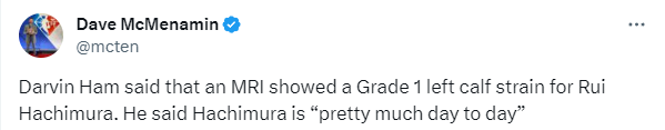 在此前输给鹈鹕的比赛中,八村垒不幸拉伤小腿,因伤仅仅只打了8分钟就早早退出比赛;今日赛前,湖人主帅哈姆透露八村垒的伤势,他表示八村接受了核磁共振检查,结果显示其小腿一级拉伤,暂时没有具体的回归时间表,状态是每日观察。