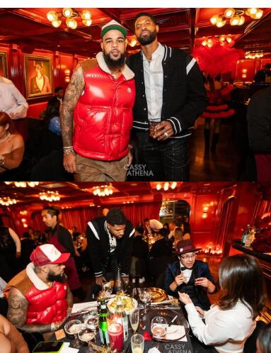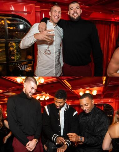 乔治与爱妻亲密合影以及碰杯喝酒,乔治还抽雪茄尽享派对;小卡、乔治等球员私下聚餐迎接新年,他们一起玩得十分开心。