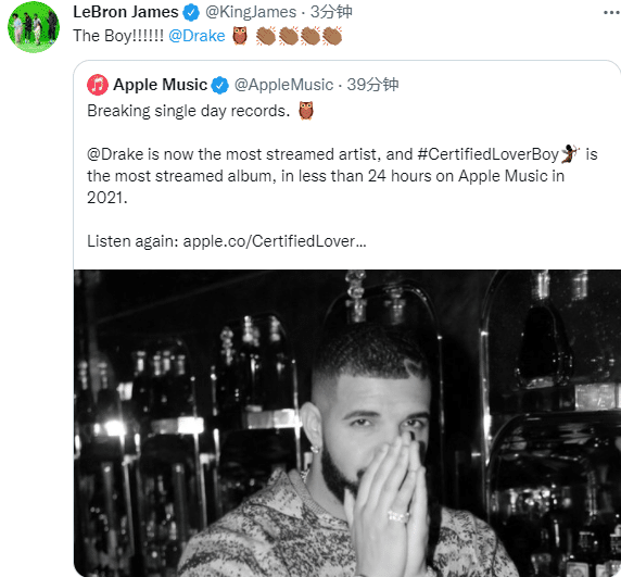Drake新的音乐专辑《Certified Lover Boy》于9月3日发行,而发行之后马上打破了Apple Music的单日播放量纪录,詹姆斯转发恭喜Drake破纪录:小伙子,为Drake鼓掌(4个鼓掌和1个猫头鹰表情)。