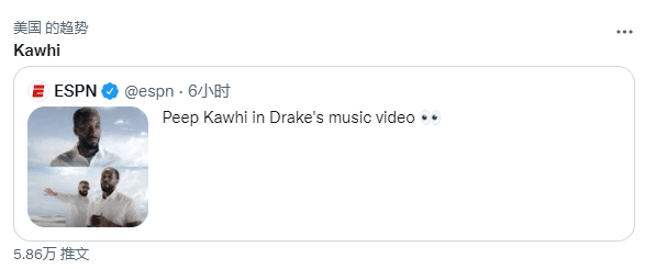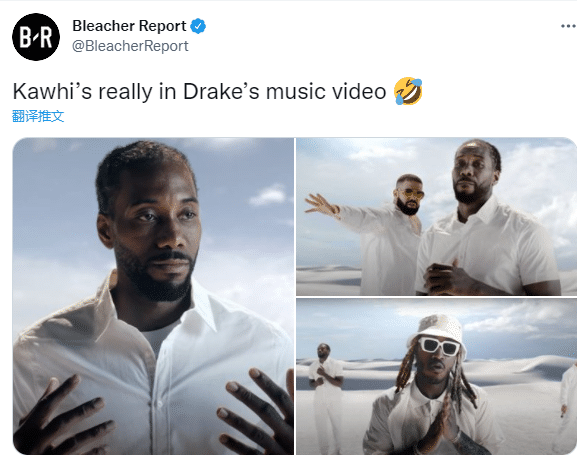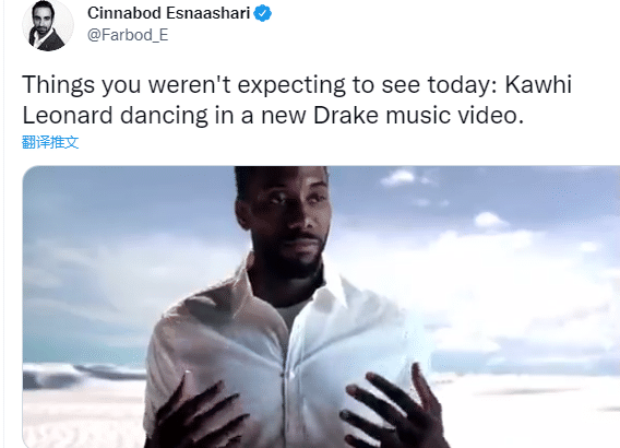 美媒《露天看台》晒出小卡在MV中的画面,发推:科怀真的现身Drake新歌之中(笑哭表情);快船记者Cinnabod annnahari发推:今天你可能想不到的事情——小卡在Drake新歌MV中跳舞。