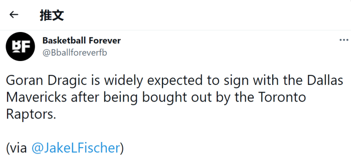 24直播网9月03日讯 ,据露天看台记者杰克费希尔报道,他在联盟中的所有消息人士都告诉他,猛龙球员德拉季奇预计会被球队买断,然后加盟独行侠联手老乡东契奇。