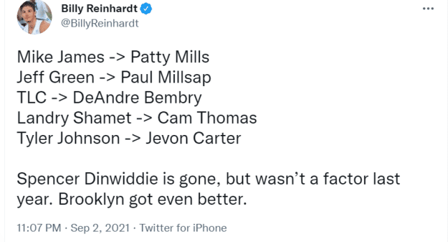 和上赛季相比,迈克-詹姆斯变成米尔斯、杰夫-格林变成米尔萨普、卡巴罗特变成本布里、沙梅特变成托马斯、泰勒-约翰逊变成杰文-卡特。虽然丁威迪离开了,但上赛季丁威迪因伤基本没打。Billy Reinhardt表示,篮网变得更好了。