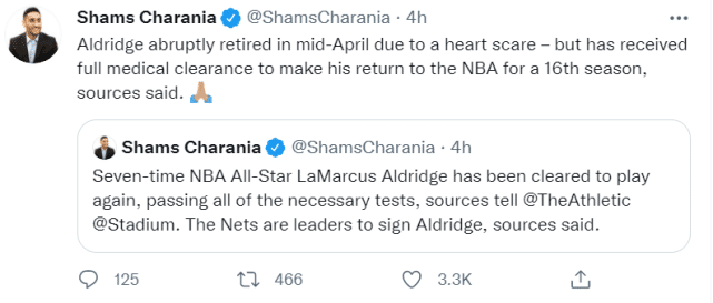 阿尔德里奇要是回归篮网,也会遇到老熟人。他和帕蒂-米尔斯在马刺、开拓者都当过队友,如果他签约篮网,这将是两人合作的第三支球队。