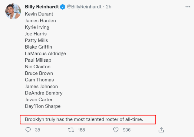 跟队记者Billy Reinhardt迫不及待提前晒出篮网的新赛季15人名单,其中已经没有小乔丹。15人名单包括:杜兰特、哈登、欧文、哈里斯、米尔斯、格里芬、阿尔德里奇、米尔萨普、克拉克斯顿、布朗、托马斯、詹姆斯-约翰逊、本布里、卡特和夏普。Billy Reinhardt感慨道:“布鲁克林真的拥有史上最有天赋的阵容!”
