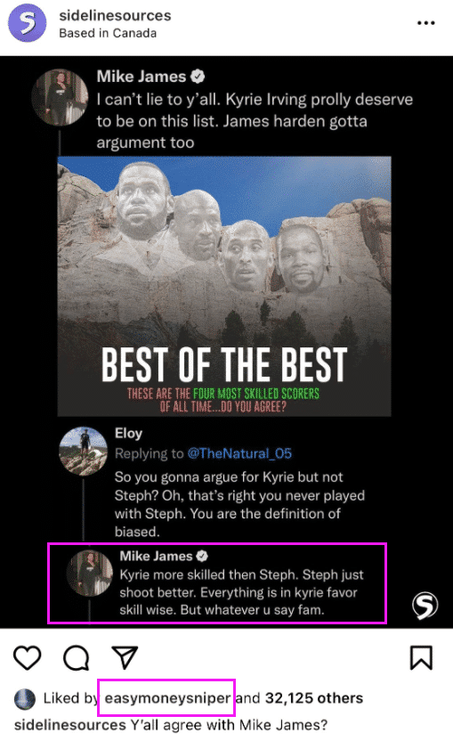 32岁的杜兰特点赞同意迈克-詹姆斯的争议观点,难道又是手滑了吗?恐怕小帅这举动又要让库里伤心了;杜兰特曾在勇士和库里一起夺得两座总冠军,可离队之后,貌似杜兰特又开始看轻前队友,同意欧文比库里技术好,欧文该入选历史得分手总统山。