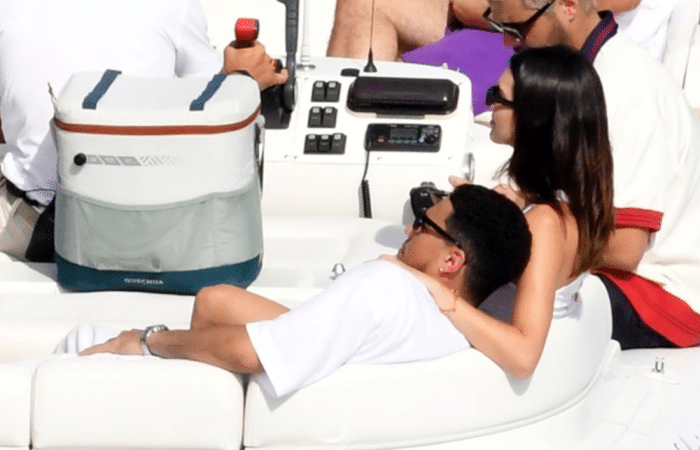 布克身穿白色小背心和灰色短裤,詹娜则是身穿黑色比基尼,凸显完美曲线和性感身材,这对情侣都斜躺在游艇的沙发上——布克搂着詹娜,两人当众接吻十分恩爱;布克和詹娜已经来到意大利一周了,从撒丁岛附近到卡普里,现在他们已经来都阿马尔菲海岸,一路乘坐豪华游艇尽享甜蜜假期。