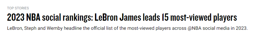 值得一提的是,联盟官方公布了NBA各大官方社媒平台在2023年的球员浏览量前15名榜单——1.詹姆斯28亿次;2. 库里16亿次;3. 文班亚马13亿次;4. 约基奇12亿次;5. 东契奇9.14亿次;6. 塔特姆7.63亿次;7. 杜兰特6.48亿次;8. 巴特勒6.34亿次;9.字母哥5.92亿次;10.贾马尔-穆雷4.56亿次;11.安东尼-戴维斯4.56亿次;12. 欧文4.54亿次;13.奥斯汀-里夫斯4.10亿次;14. 恩比德3.96亿次和15. 莫兰特3.85亿次。