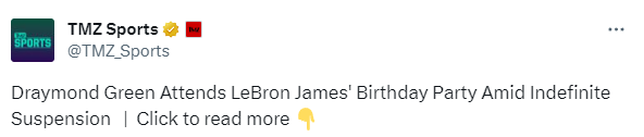 据报道,勇士球星德雷蒙德-格林参加了詹姆斯的生日派对,他身穿一套银色西装亮相。格林进场之前和安东尼-戴维斯一起做着标志性的摇摆庆祝动作,他的精神状态很好;自从一巴掌打倒努尔基奇后格林一直被禁赛,无限期禁赛期间,格林需要参加心理咨询课程,他还将定期参加和球队、联盟以及球员工会的线上会议,汇报复职进展情况。