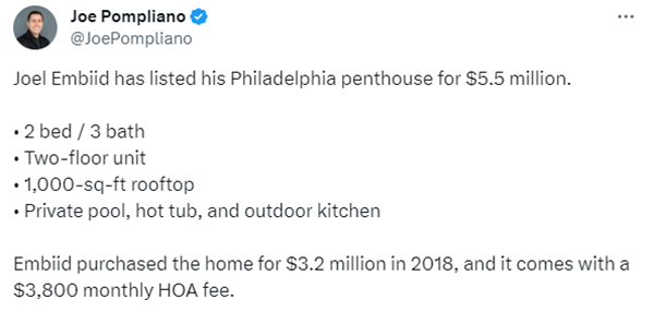 恩比德已经以550万美元的价格卖掉了自己的一处房产,该顶层公寓共两层,总面积超过3500平方英尺,有3个浴室,还有私人游泳池、室外厨房等;这套公寓是恩比德在2018年以320万美元的价格买下的,5年后售价550万美元,靠该处房产狂赚230万美元。