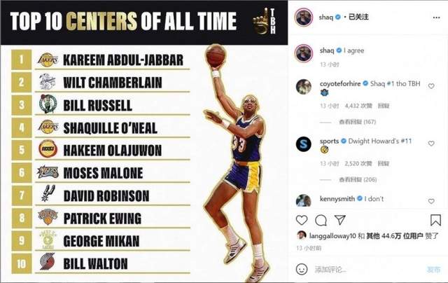 谁才是NBA联盟历史上十大中锋?奥尼尔社媒晒出排名图,无法辩驳