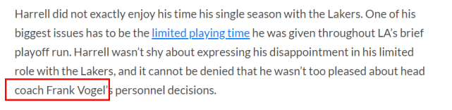 美媒clutchpoints表示,哈雷尔没有指名道姓,但显然他不喜欢湖人队内的一些人。他不止一次表达过自己的想法,而美媒猜测哈雷尔最不满的那个人应该是弃用他的主帅沃格尔。