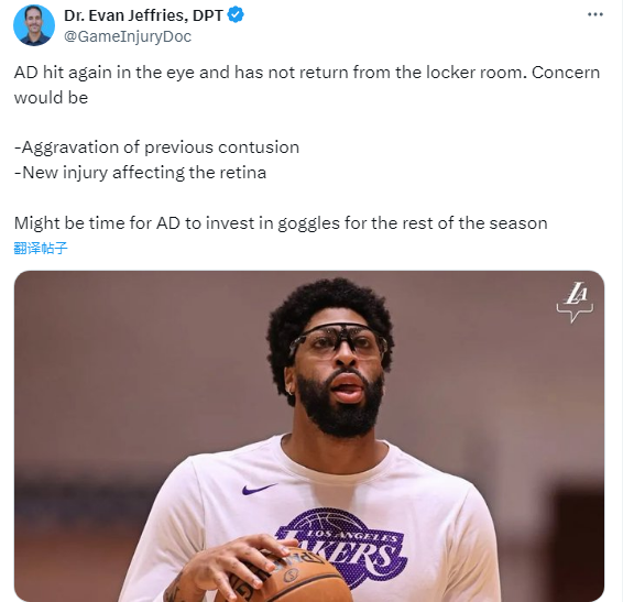 对于浓眉受伤,医学专家Evan Jeffries表示浓眉的眼睛又被打到了,一直没有从更衣室中回来,令人担忧的是,他此前挫伤的眼睛伤势加重,影响视网膜,也许在剩余的比赛中,浓眉应该佩戴护目镜参加比赛。