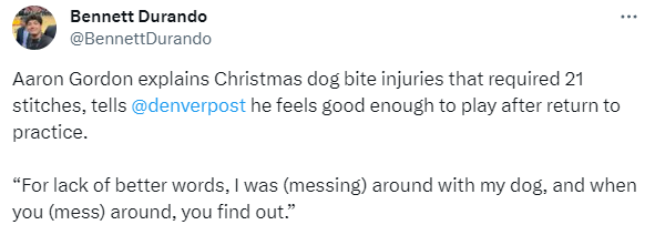 在圣诞节期间,掘金官方宣布戈登的面部和右手被狗严重咬伤,暂时离队接受治疗,名记shams报道,戈登的面部和手部总共缝了21针,戈登的离奇受伤引热议。