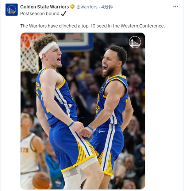 火箭正式出局,与此同时勇士锁定西部最后一个前十席位,至少获得参加附加赛的资格,勇士官方晒库里与波杰合影庆祝锁定前十;另外勇士主场轻取爵士,43胜35负继续排在西部第10位,暂时落后湖人1.5个胜场。