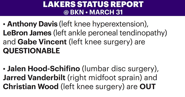 24直播网讯 北京时间3月31日,湖人官方正式公布下一场对阵篮网的伤情报告,詹姆斯和浓眉都因伤出战成疑,文森特迎来复出利好,连续伤停46场后终于被列为可能出战。