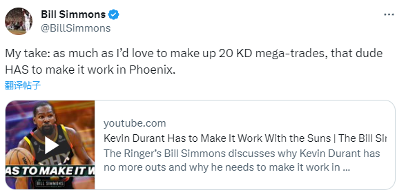 比尔-西蒙斯在节目中表示:“我知道杜兰特有些沮丧,但他不能再换队了,他必须在太阳取得成功。我知道任何球员都有改换门庭的权力,签合同也不代表要终生相守,但KD已经换了四次队了。这里和钱也没有任何关系,问题出在,如果杜兰特再换队,他的生涯荣誉和声望就会真的受损,你可以会说他才不在乎这些。但在我看来,他就是很在乎,他真的很在乎自己的历史评价,他在联盟努力了那么多年就是为了这个。”