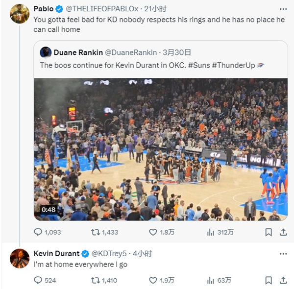 杜兰特遭狂嘘被吐槽,有球迷表示:到现在都没人尊重杜兰特的冠军,杜兰特也没有能称之为第二故乡的城市,这对杜兰特来说太糟糕了。对此,杜兰特本人回应:我去哪里哪里就是家。