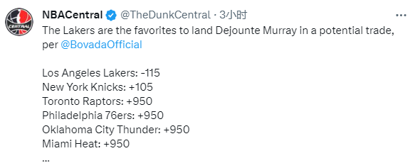 老鹰球星穆雷的最新下家赔率出炉,具体情况为——1、湖人-115;2、尼克斯+105;3、猛龙、76人、雷霆、热火+950;目前湖人领跑穆雷下家赔率,换言之,博彩网站最看好湖人引援穆雷。