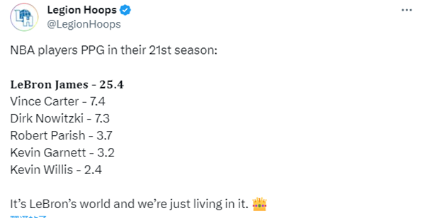 本赛季至今,詹姆斯场均拿到25.4分7.8篮板7.3助攻以及1.5次抢断,第21年仍旧场均至少轰下25分,据统计,在NBA历史球员生涯第21季场均得分榜上——詹姆斯场均25.4分断档遥遥领先,卡特7.4分、诺维茨基 7.3分、罗伯特-帕里什3.7分和加内特3.2分;对此Legion Hoops直言:这是勒布朗的世界,我们只是生活在其中。