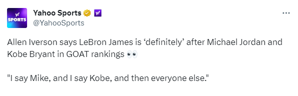 艾弗森还表示詹姆斯在这剩余的其他人之中,换言之,在艾弗森心目中的历史最强球员名单中,詹姆斯是排在乔丹和科比之后。