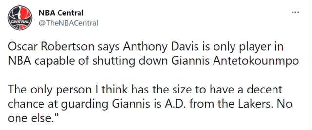 “唯一一个球员,我认为从身形上有机会防住扬尼斯(字母哥)的就是湖人的AD(浓眉)。其他人都不行。我不认为在防守端还有其他人能够搞定扬尼斯。”罗伯特森在采访中说道。