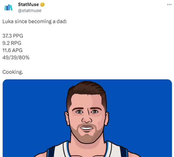 据美媒统计,自从东契奇当爸爸后,他总共出战11场比赛,场均能够得到37.3分9.2篮板11.6助攻,还有1.5抢断0.8盖帽,投篮命中率48.9%,三分命中率38.6%,期间东契奇4次拿到三双;当爸爸后,东契奇的场均得分、篮板和助攻都比本赛季场均数据更高。