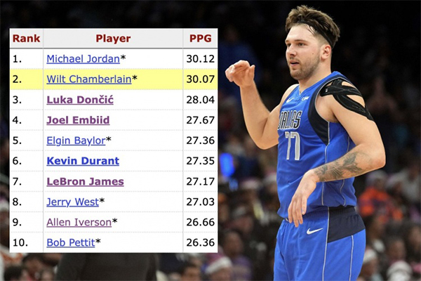 东契奇又一神迹力压詹姆斯、杜兰特且并肩乔丹张伯伦,据统计,东契奇的生涯场均得分已经来到28.04分,排名历史第三,史上仅次于乔丹(30.12分)和张伯伦(30.07分);目前杜兰特场均27.35分排在第6位,詹姆斯场均27.17分排在第7位。