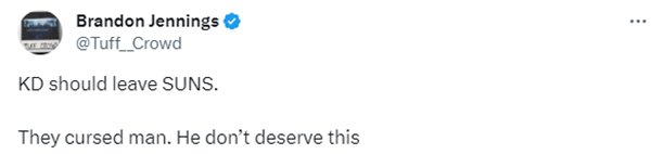 对于太阳的现状,前NBA球员布兰登-詹宁斯发推直言:我认为杜兰特应该离开太阳,菲尼克斯不值得他如此付出。