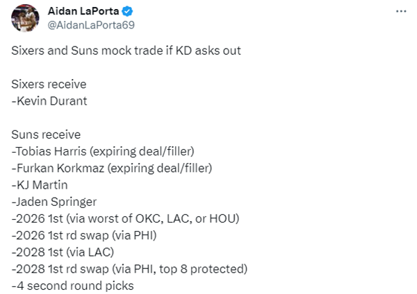 76人记者Aidan LaPorta不仅表示杜兰特是恩比德的最佳搭档,希望76人管理层引援杜兰特,而且列出一笔杜兰特1换12的交易方案,详情如下——