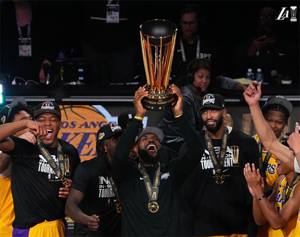在2023-24赛季,NBA举办了史上第一届季中锦标赛,詹姆斯和浓眉带领湖人以7胜0负的全胜战绩夺得首届季中赛冠军,詹姆斯夺得首个季中赛MVP奖杯;湖人全队佩戴夺冠奖牌以及每人赢得50万美元的奖金,之后湖人众将在更衣室狂喷香槟庆祝夺冠。