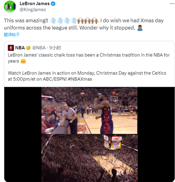 NBA官方晒詹姆斯曾在圣诞大战赛前抛镁粉的经典画面,为即将到来的圣诞大战预热;詹姆斯转发视频并且写道:那太棒了!我真的希望联盟仍然有圣诞版球衣。我想知道为啥没了。