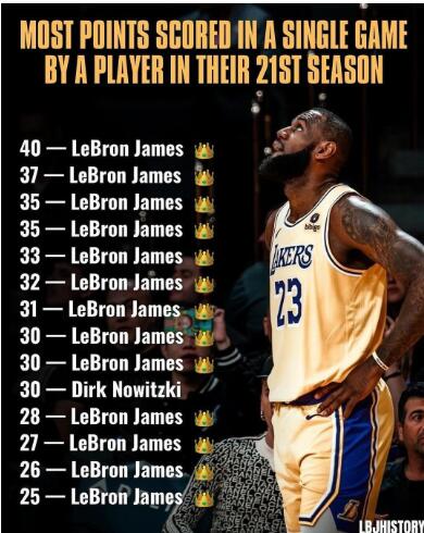 除了晒恶搞自己的视频之外,詹姆斯还晒出自己创造的多项历史纪录——历史上砍下至少40分且三分命中率100%最老的球员;詹姆斯不断刷新第21个赛季的球员得分纪录,从25分到超越诺维斯基,再到40分创历史新高;目前在球员生涯第21赛季单场得分排名榜单上,前九名都是老詹。