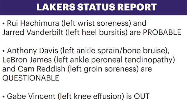 湖人全队6名轮换球员有伤,詹姆斯和浓眉都在伤病名单上,预计他们将继续带伤出战;文森特的左膝伤势复发,复出一场后连续伤停,他正在考虑接受膝盖清创手术,若接受手术,他可能缺席6-8周。