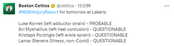 凯尔特人官方也公布年终大战伤情,科内特(左内收肌)大概率出战;米哈伊柳克(左脚后跟挫伤)、波尔津吉斯(左脚踝扭伤)和拉马尔-史蒂文斯(生病,非新冠)都是出战成疑;塔图姆和布朗都不在伤病名单上,他们将继续出战。