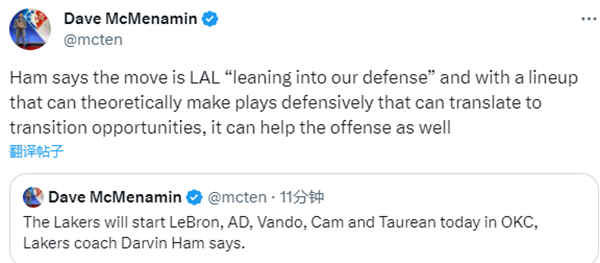 谈到变阵的原因,哈姆表示这一变阵代表湖人的重心“向防守倾斜”。“从理论上来说,这套阵容可以在防守端发挥作用,然后制造转换进攻的机会,这样也有助于进攻。”