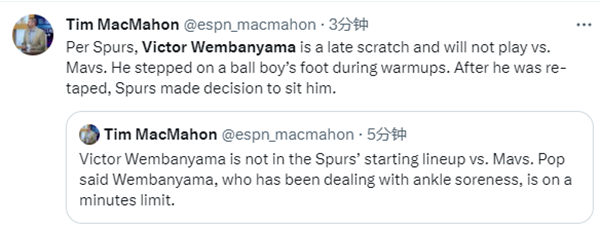 文班亚马意外退赛:热身踩到球童扭伤右脚踝 不幸遭杜兰特式悲剧