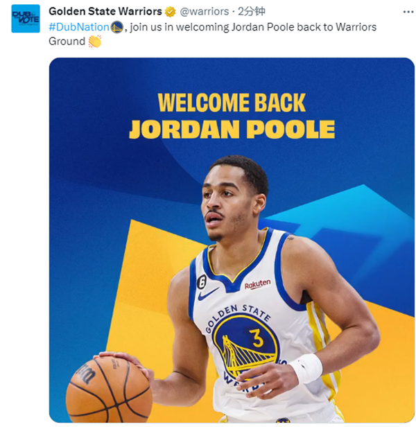 勇士官方晒视频欢迎普尔回归,写道:和我们一起欢迎普尔重返勇士球馆;在39秒的致敬视频中,有普尔被勇士选中的画面,还有普尔再进精彩进球以及夺冠后疯狂庆祝的画面,值得一提的是,追梦格林也出现在致敬普尔的视频中,仅出现一瞬间。