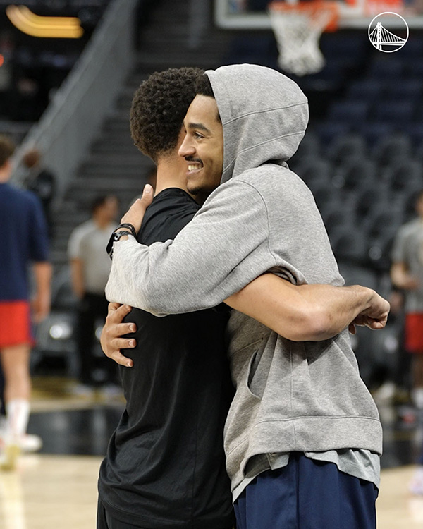 赛前,普尔早早来到大通中心球馆热身备战,期间普尔休息期间,库里主动走过来与普尔打招呼,两人拥抱以及开玩笑;克莱、卢尼、库明加、小佩顿也和普尔拥抱闲聊,普尔甚至直接瘫在卢尼的怀中,现场氛围真是满满的兄弟情。
