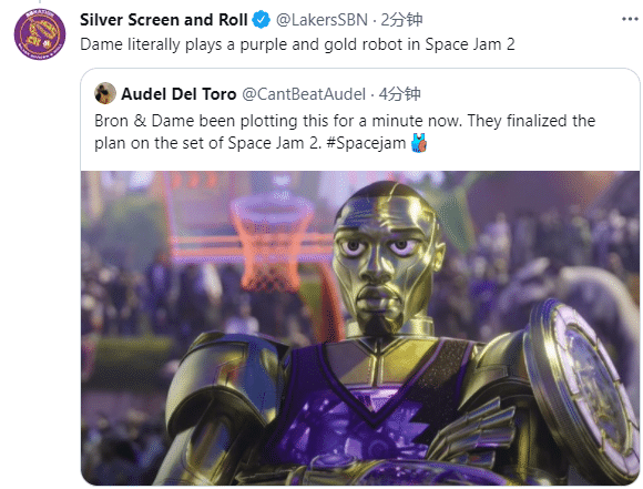 第一、球迷表示詹姆斯和利拉德早已在合作电影时敲定了联手的计划;美媒 Silver Screen and Roll发推写道:利拉德在《空中大灌篮2》中扮演机器人,身上的颜色是紫金配色;