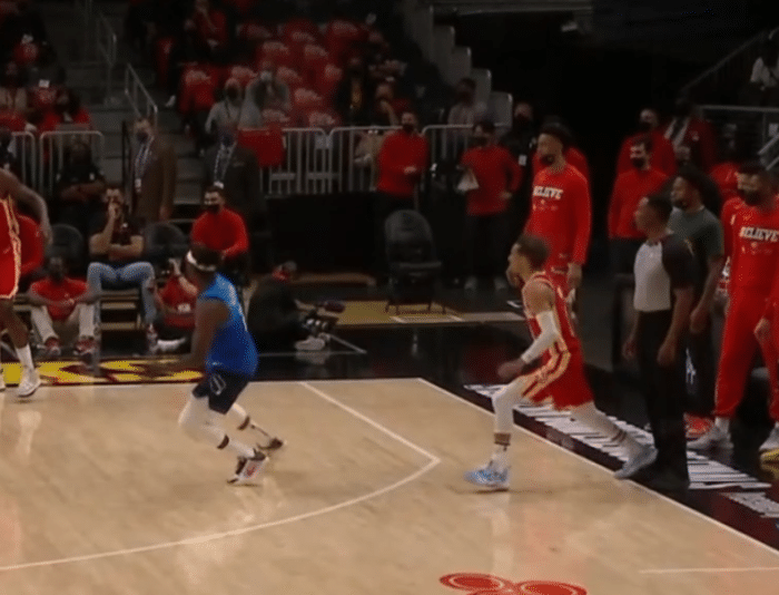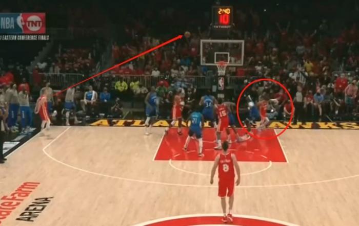 特雷杨秀超远三分后装逼庆祝,助攻同样精彩——特雷杨持球突到禁区,传球被干扰之后特雷杨飞身救球并且助攻赫尔特投进底角三分,队友还没出手,特雷杨已经开始提前庆祝。