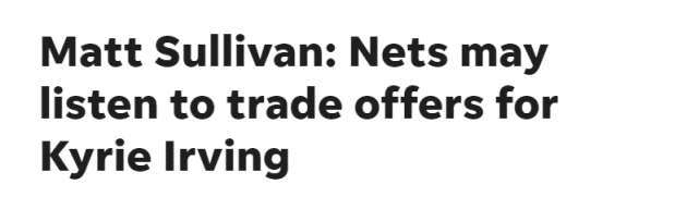 在最新一期播客节目上,Matt Sullivan说道:“我听说篮网管理层对于欧文在赛季期间的‘暂停(指离队事件)’感到非常不满,尤其是他参加了那个不戴口罩的派对,把所谓的陪产假变成了隔离。上周,我听到一些风声,篮网总经理肖恩-马克斯在休赛期可能至少愿意听取关于凯里(欧文)的报价。”