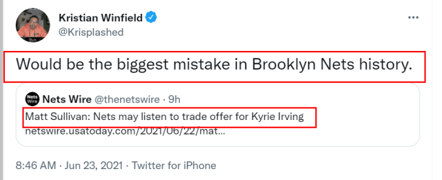 Sullivan的报道引起球迷的热议,意见也大致分为两种。一种是认为篮网不能考虑交易欧文,因为三巨头是篮网再次冲冠的根本保障,另一种认为杜兰特和哈登就够了,与其留着欧文这位第三球星,不如把他换成更多有实力的角色球员,进一步提升阵容深度。