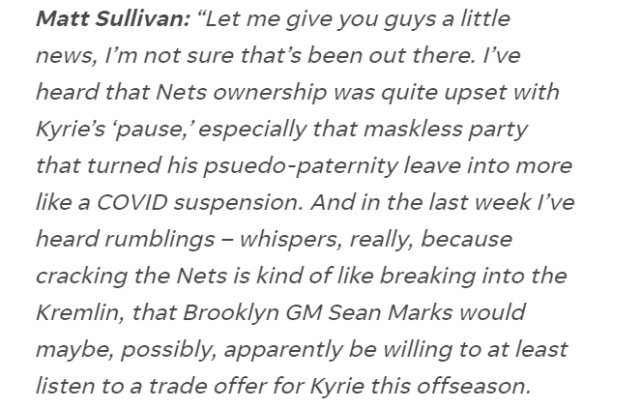 24直播网讯 昨日23日,据NBA记者Matt Sullivan报道,欧文在这个赛季的一些做法,惹恼了篮网高层的一些成员,这导致欧文在今年夏天有被交易的可能性。