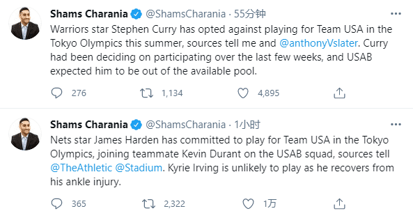 库里拒绝参赛!哈登承诺参加奥运会,杜兰特领衔8大球星助名帅冲金牌
