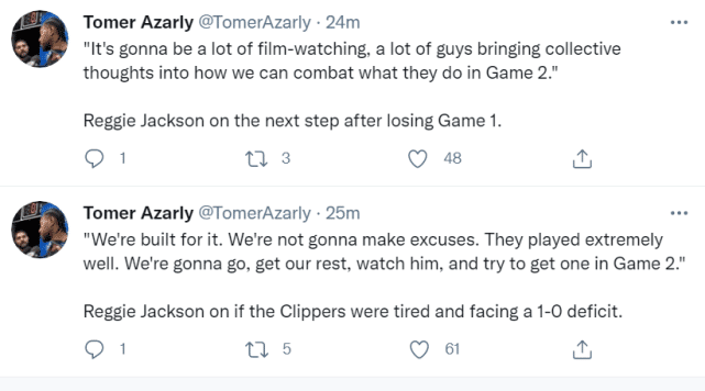 输掉第一场后的快船,该怎么办呢?雷吉说:“我们会研究大量的比赛录像,大家提出各自的建议,看看我们能在G2里做些什么。我们还要好好休息一下,力争拿下第二场的胜利。”